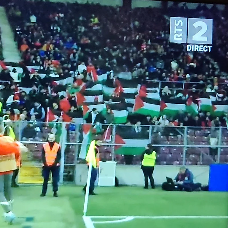 ووثق مقطع فيديو للجماهير السويسرية انتشر كالنار في الهشيم على مواقع التواصل الاجتماعي وهي ترفع العلم الفلسطيني وبعض اللافتات المنددة بالاحتلال وسياسة الفصل العنصري، على مدرجات ملعب "جنيف".