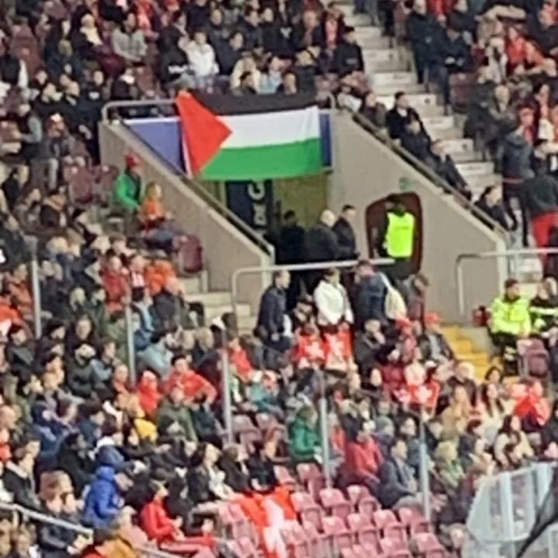 وكشف أحد مقاطع الفيديو رفع عشرات المشجعين الأعلام الفلسطينية، وهم يتفاعلون على صوت موسيقى داخل الملعب، فيما يبدو أنها رفعت في وجه اللاعبين الإسرائيليين.