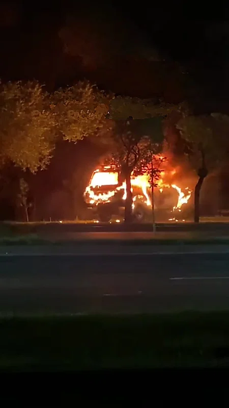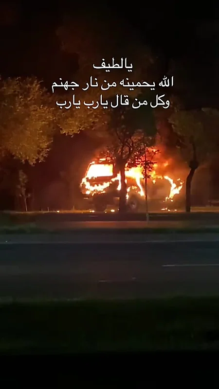 وظهرت المركبة في مقطع فيديو والنيران تلتهما من كل جانب، فيما يحاول قائدها الابتعاد بها عن الطريق والمارة.