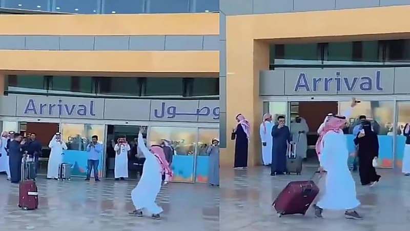 ووثق مقطع فيديو، لحظة خروج المسافر من المطار، ليتفاعل بشكل عفوي مع فعاليات يوم التأسيس، ويرقص مع الفرقة التراثية.