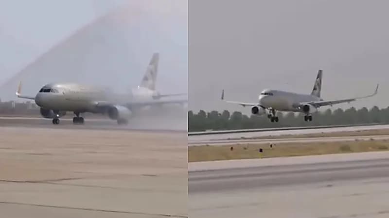 لحظة هبوط أول رحلة لطيران الاتحاد بمطار الأمير نايف بالقصيم